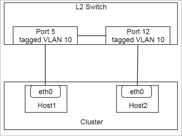 在上图这个配置中,交换机的两个端口5和12是带VLAN 10标签(tagged VLAN 10)的端口, 这样管理员就可以使用physicalInterface = eth0和vlan = 10创建L2VlanNetwork,并将它挂载到集群上。