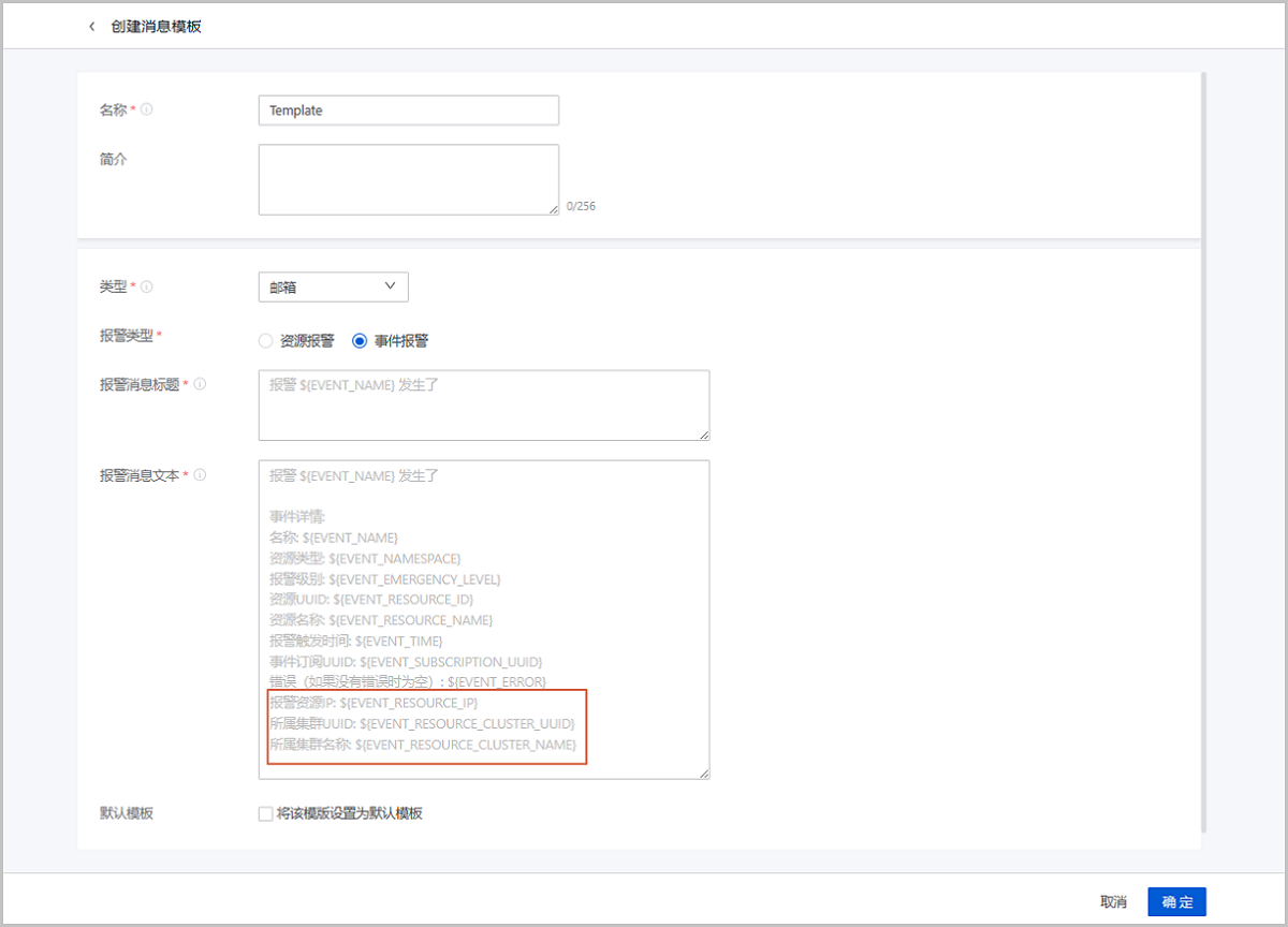 ZStack Cloud 5.0.0开始,邮箱、钉钉、飞书、企业微信、HTTP应用、Microsoft Teams消息模板支持三个新字段:报警资源IP、所属集群UUID、所属集群名称。用户可根据实际情况,在自定义消息模板中增添以上字段,以获取更详细的报警信息。