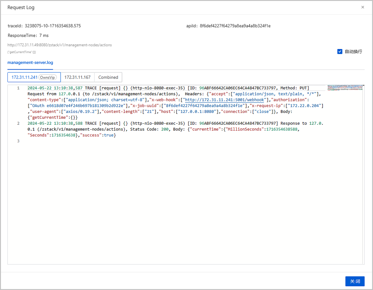 同时,ZStack Cloud 4.8.10版本中,API Inspector可展示请求SDK,并支持点击查看请求日志,包括UI请求相关的zstack-ui-server.log、nginx-access.log及后端请求相关的management-server.log,日志信息支持换行展示,帮助用户掌握更详实的API调用情况。
