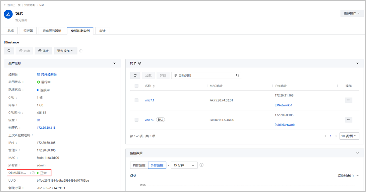 除云主机和VPC路由器外,ZStack Cloud 4.6.21还支持展示负载均衡实例的QEMU状态。在负载均衡详情页,点击负载均衡实例标签,即可查看其QEMU状态。QEMU状态为待更新时,表示负载均衡实例与所属物理机QEMU版本不一致,需通过迁移或重启完成QEMU版本更新。