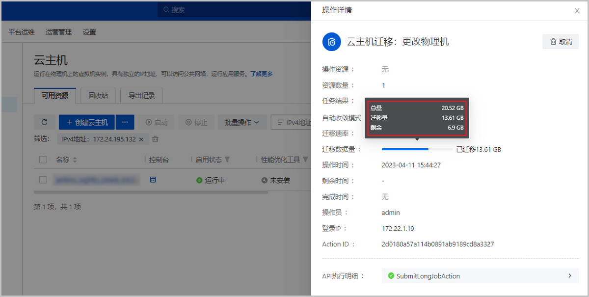 ZStack Cloud 4.6.21开始,云主机热迁移 (在线更改物理机、在线更改主存储、在线更改物理机和主存储) 时,新增支持动态展示热迁移的实时速率和迁移数据量。