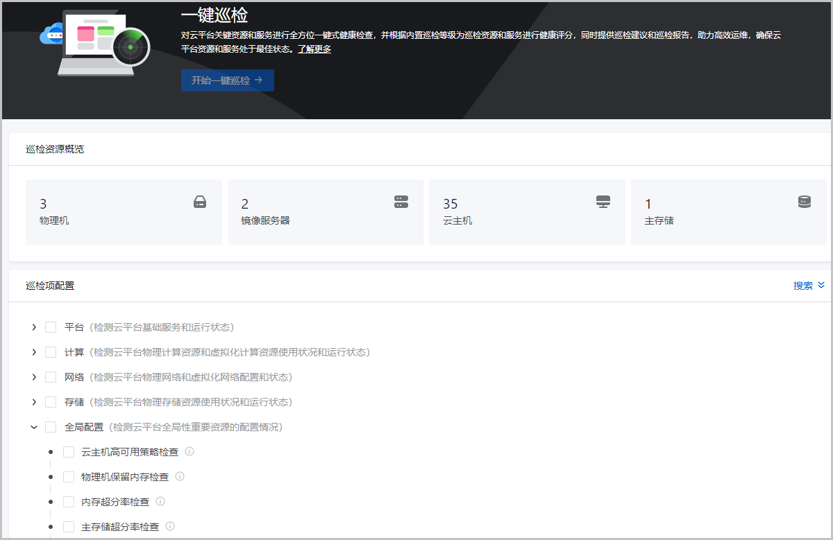 一键巡检提供平台、计算、网络、存储和全局配置五大巡检类别,共计数十条巡检项,涵盖云平台关键资源和服务,用户可按需选择相应巡检类别及巡检项进行一键式健康检查。