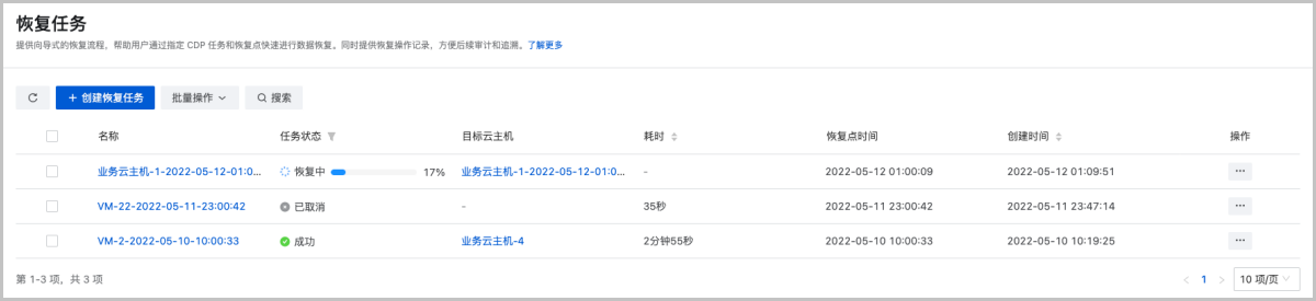 ZStack Cloud 4.4.6开始,UI界面新增“恢复任务”主列表,统一展示云平台内所有CDP恢复相关的操作记录和恢复任务状态,方便后续审计和追溯。