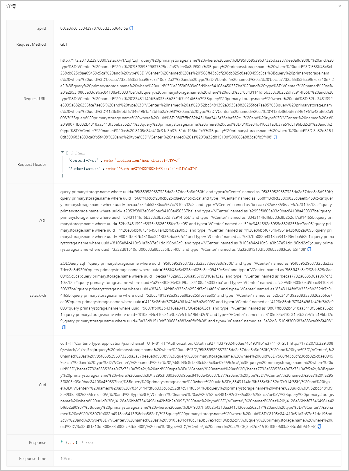 展开单条API记录详情,支持查看当前API的调用ID、请求方法、请求URL、请求头、请求体、Curl请求示例、响应结果、响应耗时等信息。其中,API调用ID可用于快速定位当前调用在管理节点前端和后端的日志记录,方便快速排查问题。对于GET-ZQL类型请求详情,特别支持查看ZQL语句,方便用户参考学习,快速掌握使用技巧,提高查询效率。所有代码段均支持复制,方便用户在第三方工具调试使用。