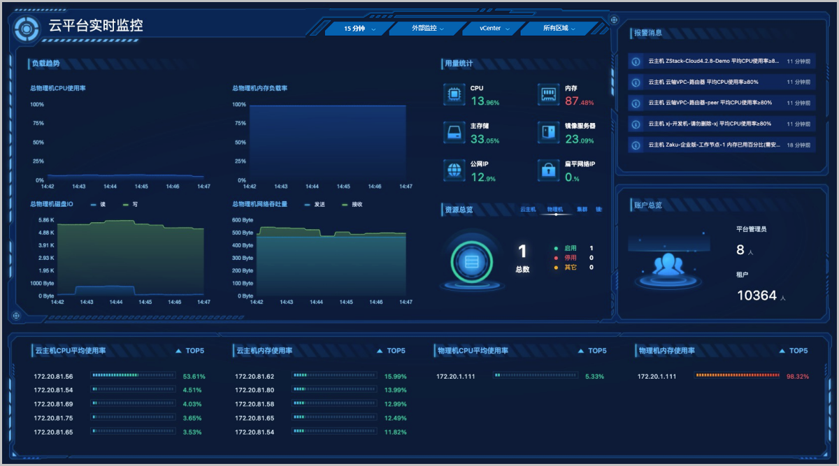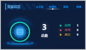 通过对所选虚拟化、区域中数据中心的云主机、物理机、镜像、集群等资源使用情况进行统计分析,对它们的资源总用量分别进行实时展示监控。