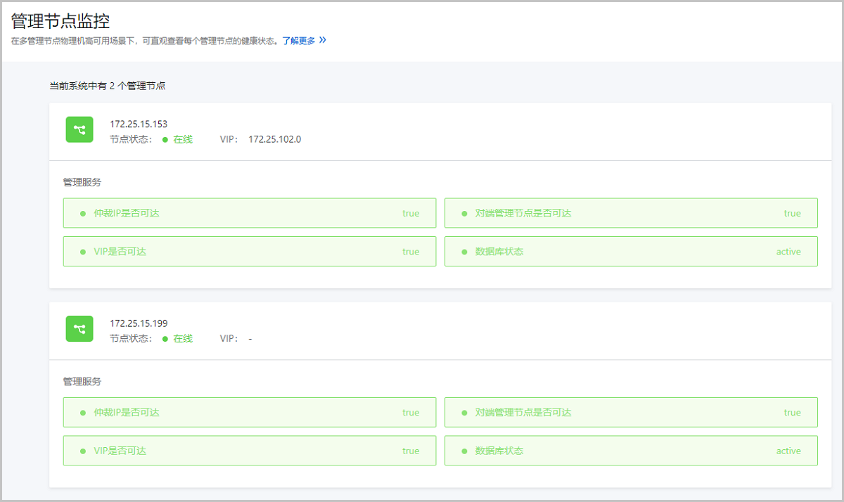 在双管理节点物理机高可用场景下,可直观查看每个管理节点的健康状态。