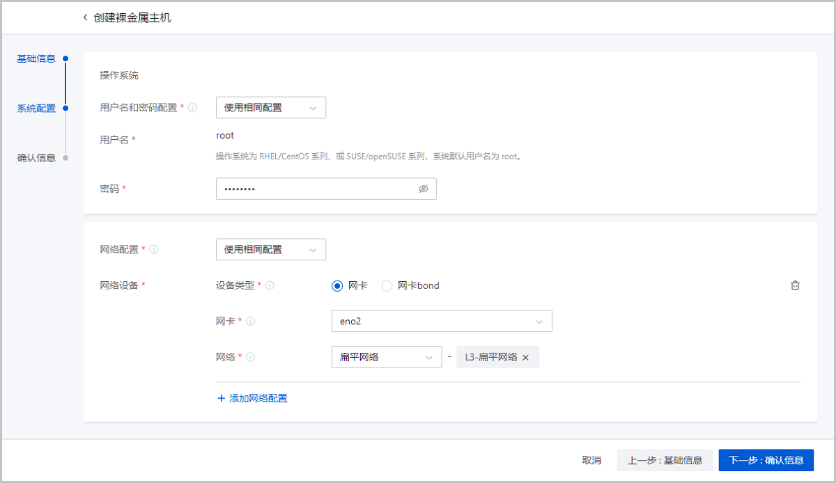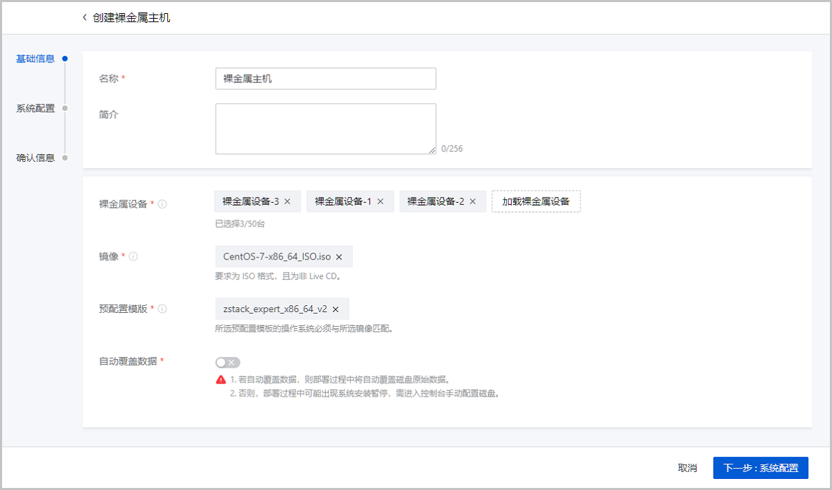 在ZStack Cloud主菜单,点击,进入裸金属主机界面。点击创建裸金属主机,弹出创建裸金属主机界面。