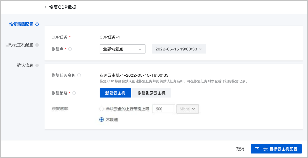 假定用户不清楚误操作发生在2022-5-15的具体哪个时刻,不敢直接覆盖原云主机,需要新建一台云主机进行恢复验证。