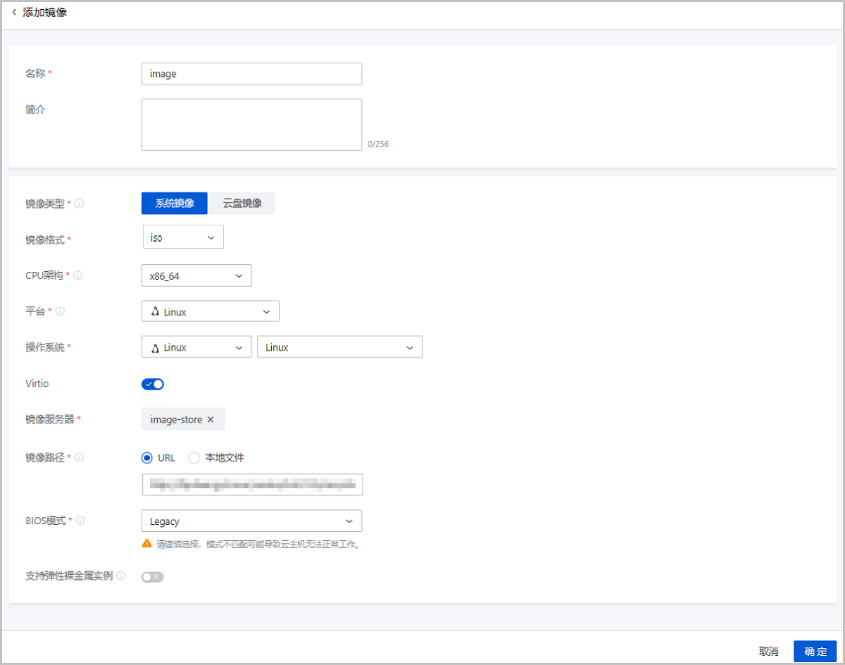 • 输入URL时,需确保可被镜像服务器访问,且存在此镜像文件。
