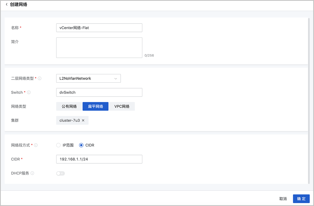 | 添加网络段 | 给vCenter网络添加网络段。IPv4 类型的公有网络支持地址池功能,可同时添加普通网段和地址池网段。扁平网络和VPC网络仅支持普通网段。 |