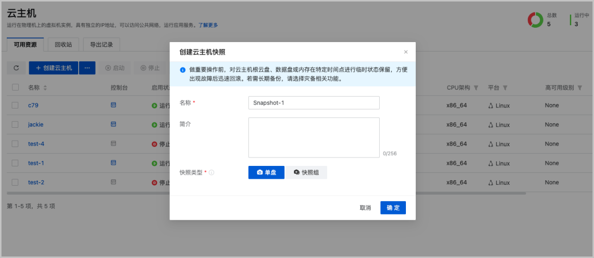且不支持以空格开头或结尾用户也可进入云主机详情页创建云主机快照。在云主机详情页的快照子页面,点击创建快照,弹出创建云主机快照界面,创建云主机快照。