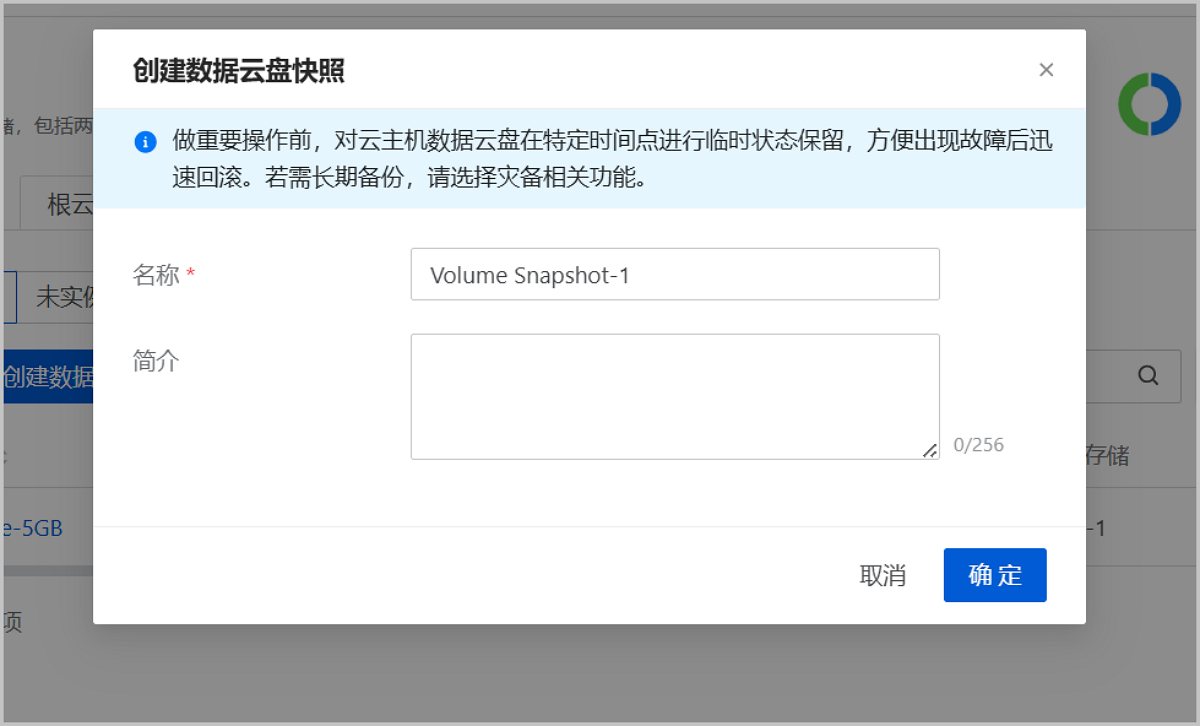 在ZStack Cloud主菜单,点击 ,进入数据云盘界面。选择某一云盘,点击 ,弹出创建数据云盘快照界面。