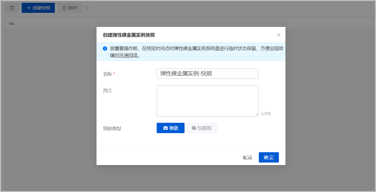 在ZStack Cloud主菜单,点击 ,进入弹性裸金属实例界面。选择某一弹性裸金属实例,点击 ,弹出创建云主机快照界面。