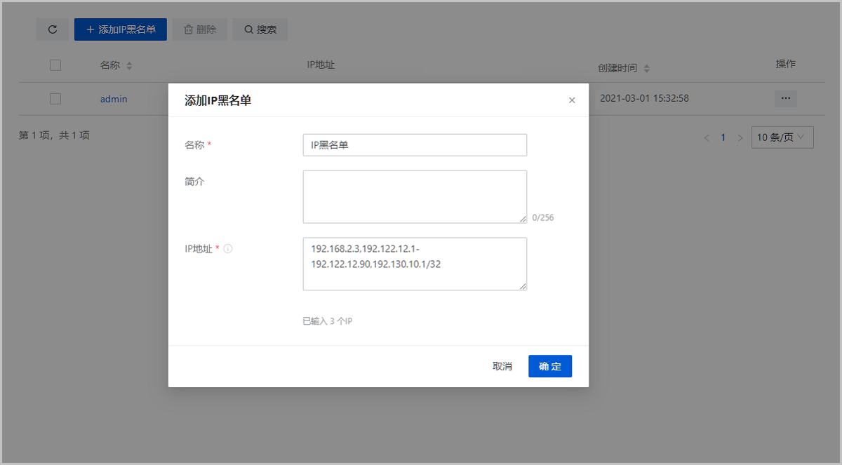 在ZStack Cube 旗舰版主菜单,点击,进入IP黑白名单界面,点击添加IP黑名单,弹出添加IP黑名单界面。