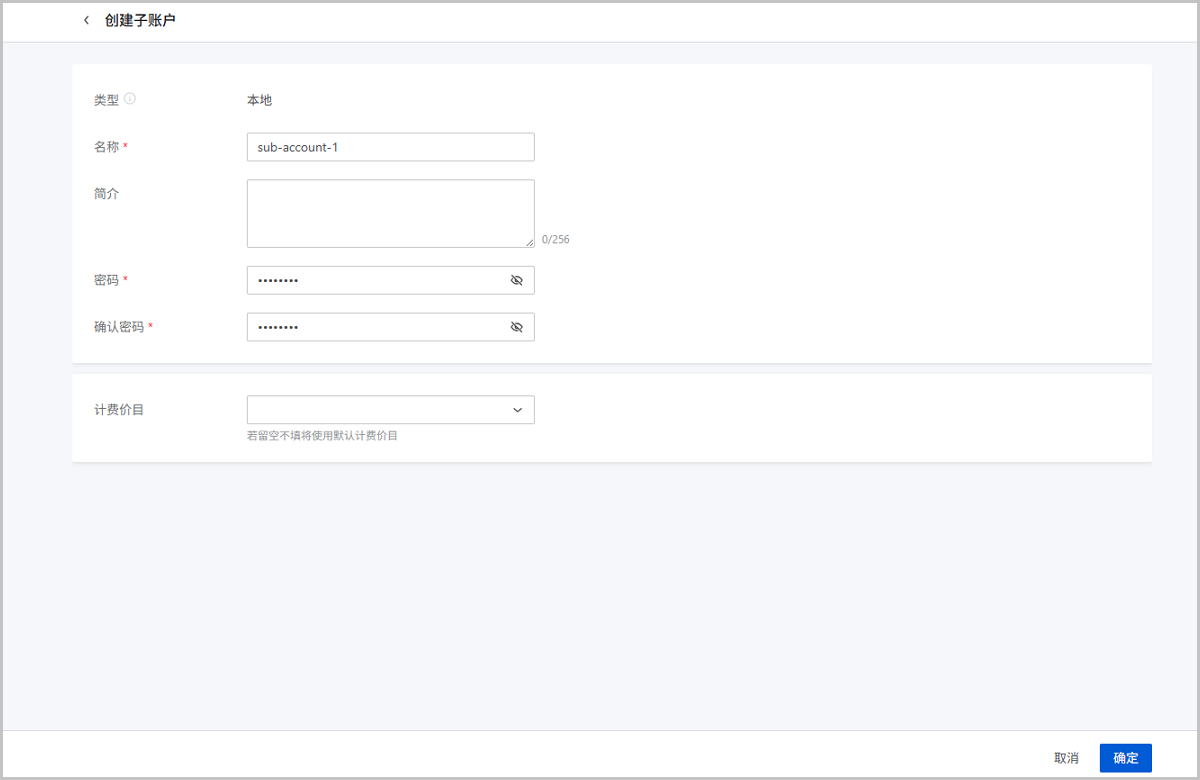 在ZStack Cube 旗舰版主菜单,点击,进入子账户界面,点击创建子账户,弹出创建子账户界面。