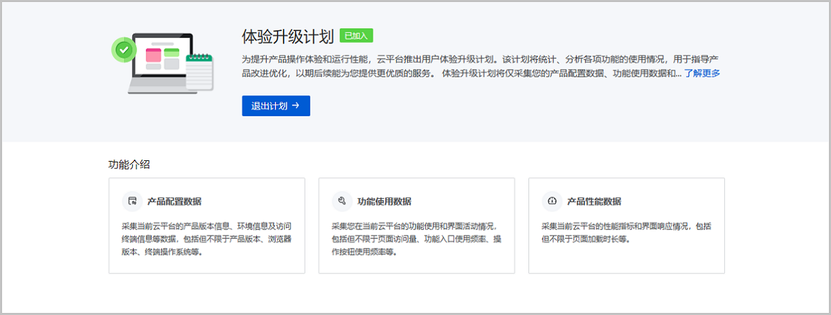 退出体验升级计划后,云平台不再继续统计分析该用户的产品使用情况。