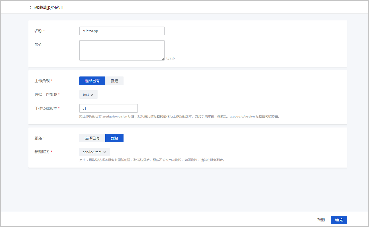 说明: 如工作负载已有 zsedge.io/version 标签,默认使用该标签的值作为工作负载版本,支持手动修改,修改后的值将覆盖到工作负载 zsedge.io/version。