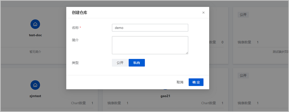 • 类型:设置仓库类型,支持公开和私有两种类型