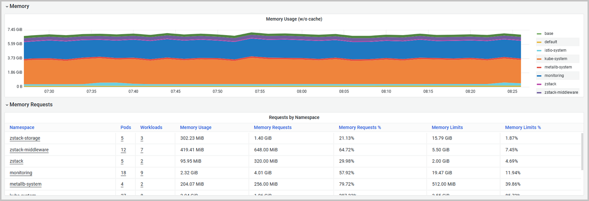 进入Kubernetes / Compute Resources / Cluster监控面板,可查看Kubernetes集群CPU使用率、内存使用率,以及各个命名空间的CPU和内存使用情况。
