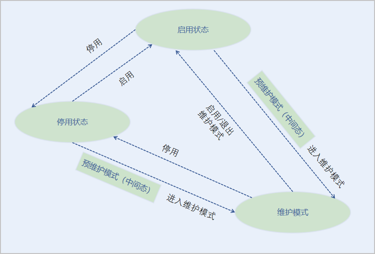 改变主机启用状态的操作包括:启用、停用、进入维护模式、退出维护模式。不同操作下,主机启用状态状态转换如图 1所示:
